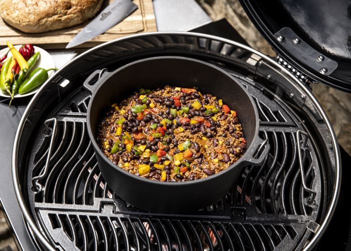 Голландская печь из низко-пористого чугуна объемом 6 литров. Чугунная посуда не боится длительного нагрева и не подвержена температурным деформациям, а ее естественные антипригарные свойства со временем только усиливаются. За счет высокой теплоемкости чугуна такая посуда долго держит тепло и экономит энергию. При ее правильном использовании и уходе, она прослужит не одному поколению семьи. Печь предназначена для приготовления супов, рагу, жаркого и даже выпечки. Отлично подходит для использования на костре, на газовых и угольных грилях, на высокотемпературной инфракрасной горелке Sizzle Zone, а так же на плите или в духовке на кухне городской квартиры. Крышку печи можно использовать, как сковороду на раскаленных углях, для этого она оснащена специальными ножками, благодаря которым, обеспечивается приток воздуха к углям для их длительного горения. Когда готовят в голландской печи на открытом огне, ее обкладывают раскаленным углем для равномерного распределения тепла внутри. Уголь кладут непосредственно на крышку, а ножки и бортик удерживают его, не позволяя упасть. Печь можно использовать, как котелок, подвесив ее за ручку на корпусе.