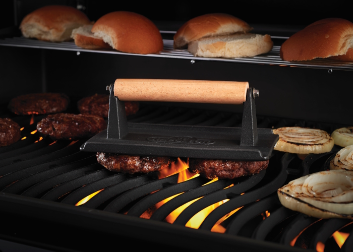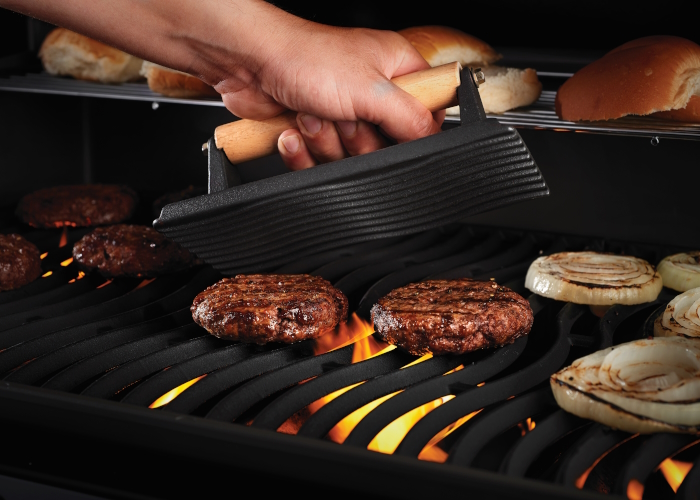 Тяжелым прессом прижимают продукты к рабочей поверхности, тем самым обеспечивая равномерное приготовление и сохранность их полезных свойств. Ребристая поверхность пресса выполнена в виде фирменного рисунка Napoleon WAVE™, который оставит красивый отпечаток на вашем стейке. Для безопасной работы ручка пресса сделана из дерева.