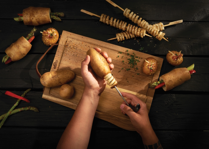 Кулинарная спираль для картофеля. С помощью нее легко удалить сердцевину из клубня для его фарширования сыром, грибами, нарезанным беконом, и дальнейшего запекания. Извлеченная сердцевина получается в виде спирали, которую можно обжарить на гриле или во фритюре, получив оригинальные чипсы. Кулинарную спираль часто используют в искусстве художественной резки по овощам и фруктам.