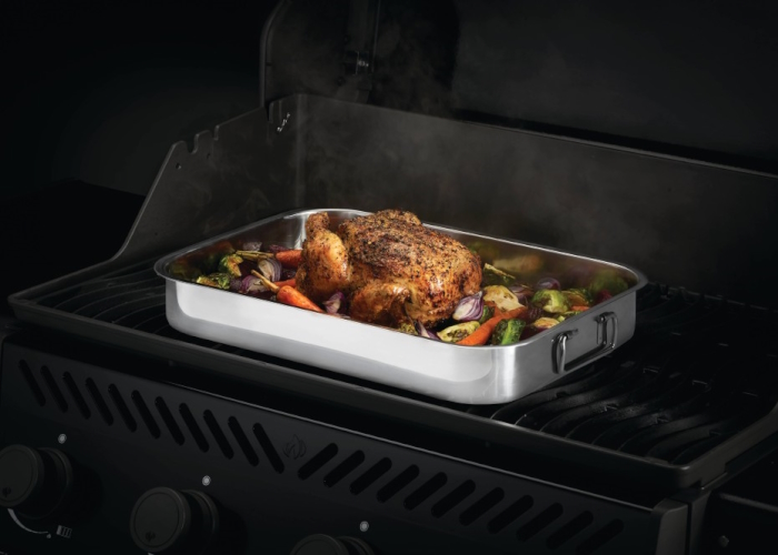 Вместительный многофункциональный противень из пищевой нержавеющей стали с решеткой удобно использовать в гриле или на кухне городской квартиры. Он идеально подойдет для запекания больших кусков мяса, птицы целиком, рыбы. Размещенный на решетке большой кусок мяса запекается со всех сторон, а стекающие с него соки будут скапливаются на дне противня, и их можно использовать для приготовления ароматных соусов и подливок. Без решетки противень можно использовать для приготовления запеканок, тушеных овощей, выпечки и других объемных блюд. Складные, прочные ручки позволят легко перемещать противень. Что бы не обжечься, не забывайте использовать термостойкие перчатки для защиты рук от высоких температур.