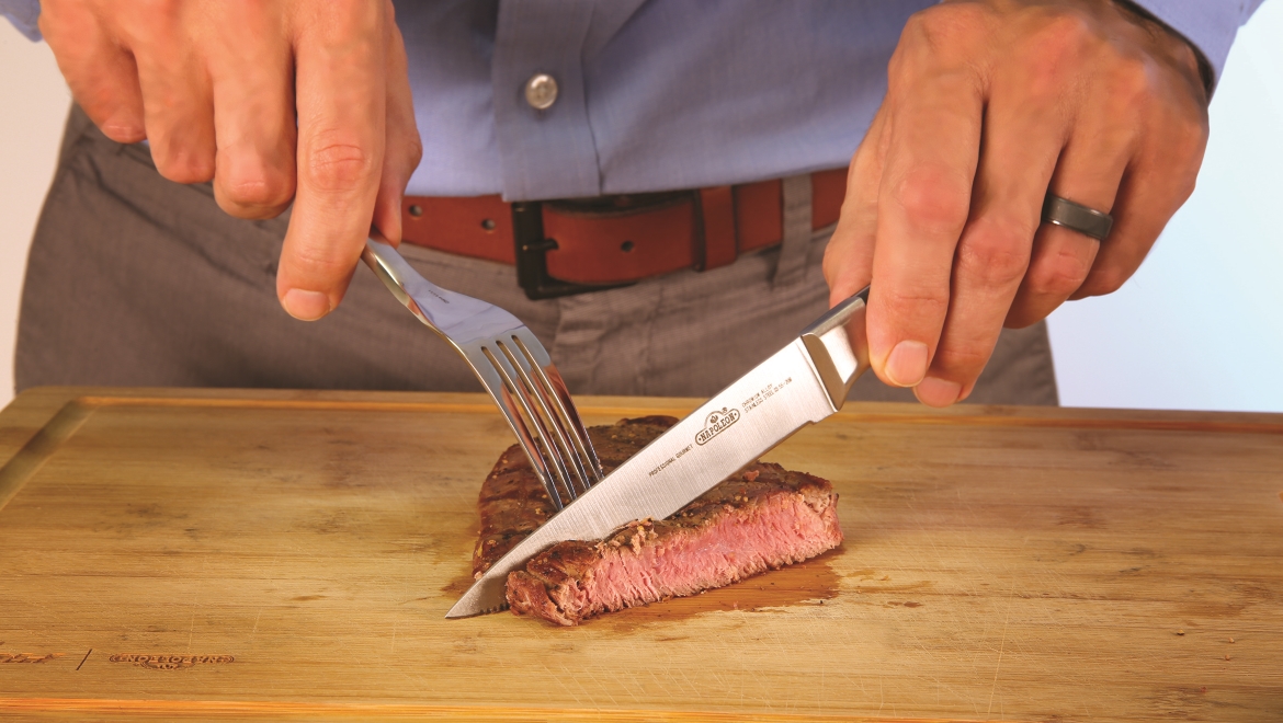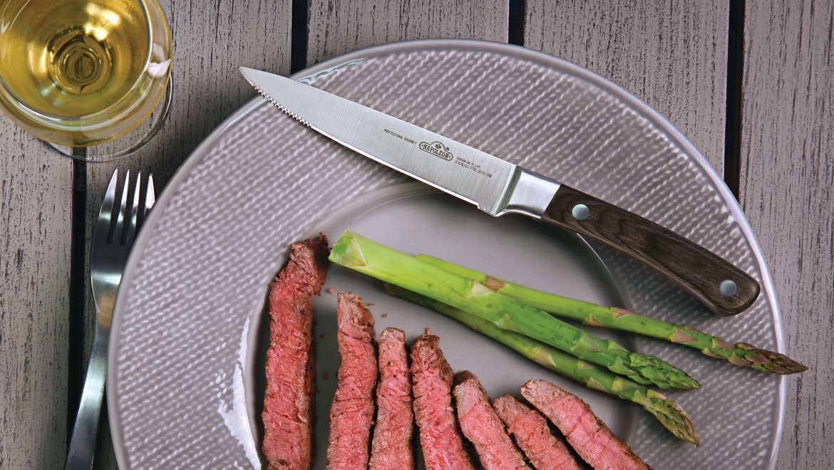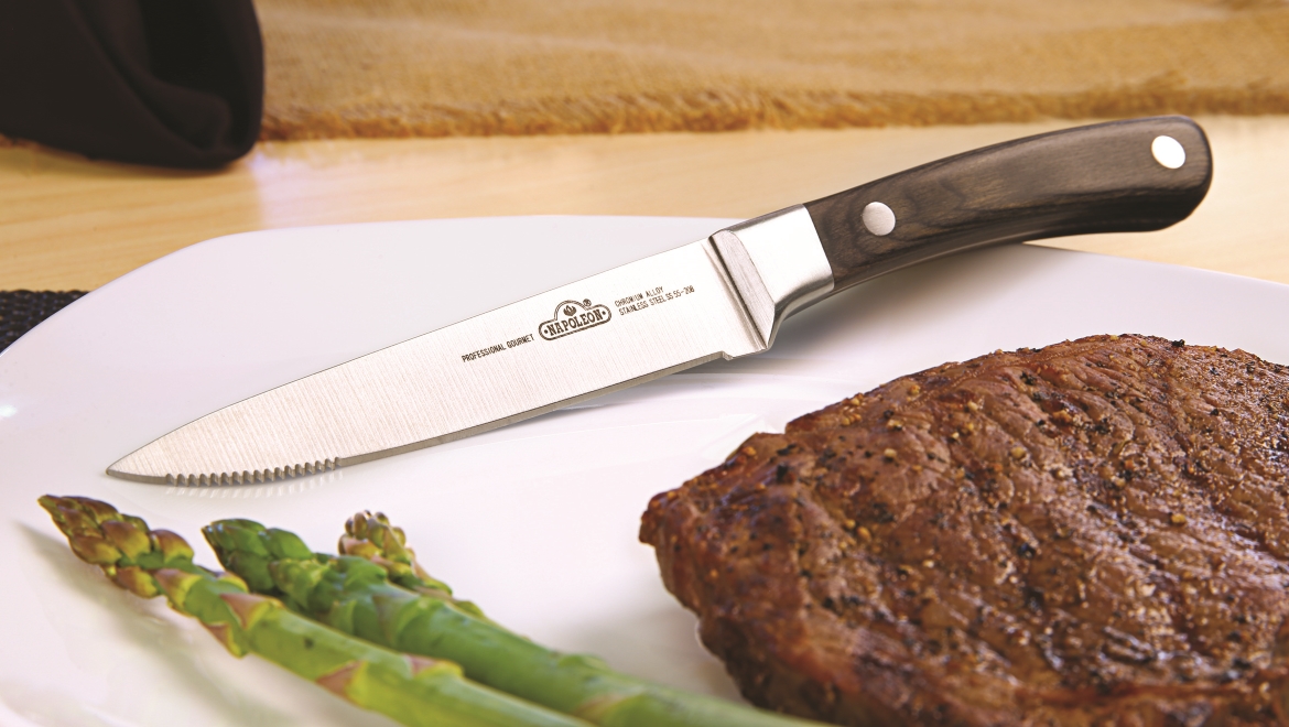 Нож для стейка серии PRO идеально подходит для сервировки стола при подаче стейков. Лезвие ножа имеет две острые, как бритва, режущие кромки - гладкую и зубчатую. Благодаря этому он легко справляется с нарезкой любого приготовленного мяса. Красивая ручка ножа выполнена из дорогого шлифованного дерева и удобно лежит в руке. Благодаря выверенной конструкции, нож отлично сбалансирован.