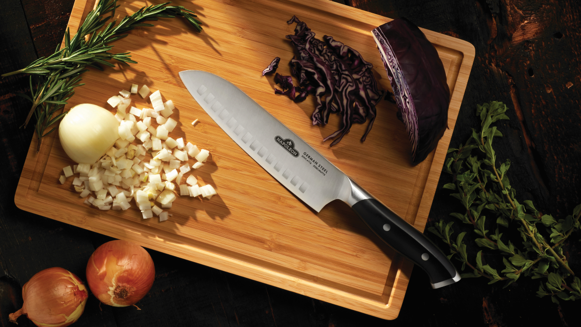 Универсальный поварской нож Santoku - это нож, который изначально создан на стыке двух культур: азиатской и западной. Считается, что название Santoku переводится, как “три преимущества” и подразумевает: нарезку, измельчение и шинковку. Благодаря идеально заточенному, широкому лезвию особой формы, такой нож справится с любыми поварскими задачами. Предпочтительно им работать без продольных движений - как гильотиной. Лезвие, длинной 18 см, имеет специальную рифленую поверхность для предотвращения прилипания пищи к ножу, благодаря этому, он способен нарезать мягкие продукты на очень тонкие ломтики. Эта модель имеет продуманную эргономику рукоятки, которая не скользит в мокрой руке и обеспечивает максимальный комфорт для человека с любым размером ладони. А благодаря выверенной конструкции, нож отлично сбалансирован.