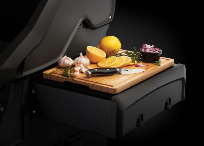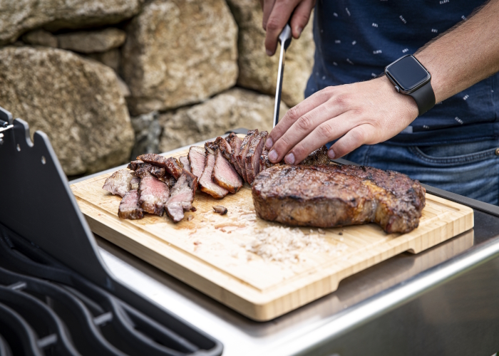 Разделочная доска из бамбука размером 37х27 см идеально подходит при готовке на гриле или повседневного использования на кухне городской квартиры. На доске расположены силиконовые ножки, которые препятствуют скольжению по поверхности и обеспечивают устойчивость, защищая столешницу или боковой столик гриля от царапин. Доска с антибактериальной поверхностью из бамбука легка в уходе по сравнению с традиционными разделочными досками, так как бамбук обладает высокой плотностью. Две ручки позволяют переносить доску даже с увесистым сочным куском запечённого мяса. Специальный жёлоб по периметру не даст соку пролиться за её края.