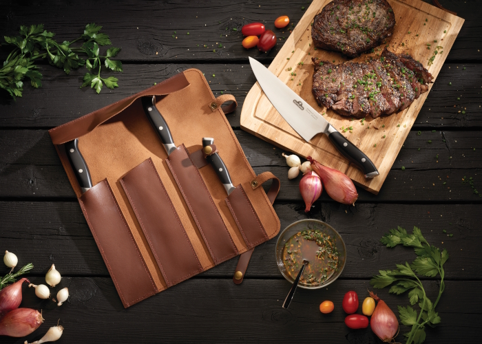 Стильная, удобная скрутка из натуральной кожи для транспортировки, хранения ножей и других поварских инструментов. Позволит не только удобно перевозить ваши ножи, но и убережет рюкзак или сумку от порезов. Ножи вкладываются в отдельные карманы и закрываются сверху клапаном, а полотно сворачивается и фиксируется двумя ремнями с кнопками.
