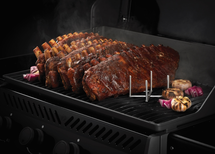 Раздвижная подставка для ребер из пищевой нержавеющей стали. Вмещает от одной до шести лент ребер. Раздвижная конструкция позволяет готовить ребра любой толщины. Складывается для компактного хранения.