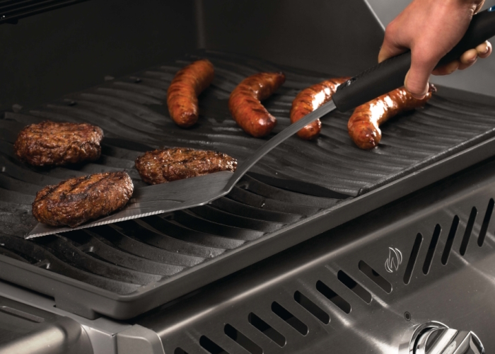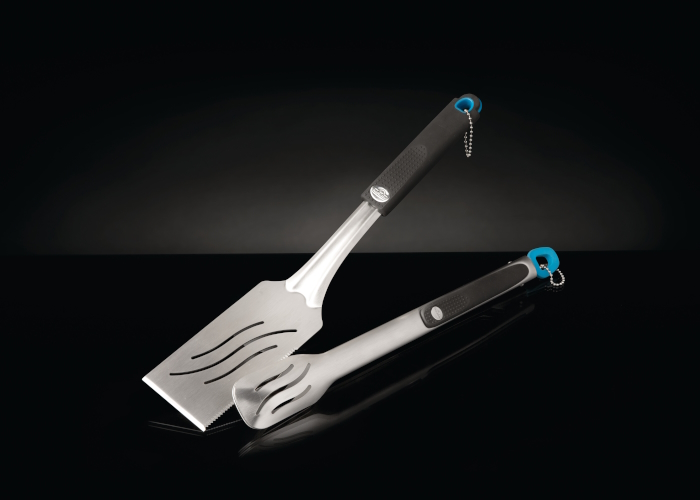 Набор состоит из двух предметов: лопатки с удлиненной ручкой и щипцов с фиксатором в сложенном виде. Аксессуары имеют термостойкие, эргономичные ручки с петлями для размещения на гриле. Заостренным торцевым краем лопатки удобно подхватывать продукты во время приготовления. А зубчатый режущий край позволяет разделять блюда на порции. Щипцы легко фиксируются в сложенном состоянии с помощью специального кольца на ручке.