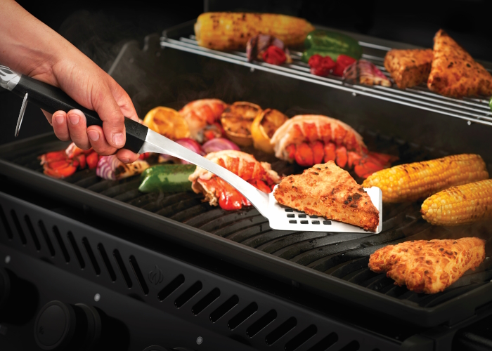На ручках лопатки и кисточки расположены открывалки для напитков. Большой, жесткой лопаткой легко переворачивать готовящиеся продукты. Заостренным торцевым краем лопатки удобно подхватывать продукты во время приготовления, а острым, зубчатым режущим краем легко разделять блюда на порции. Щипцы фиксируются в сложенном состоянии с помощью специального кольца. Кисть, это отличный инструмент для смазывания блюда или жарочной поверхности при готовке.
