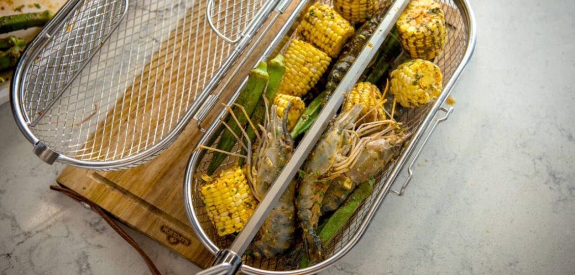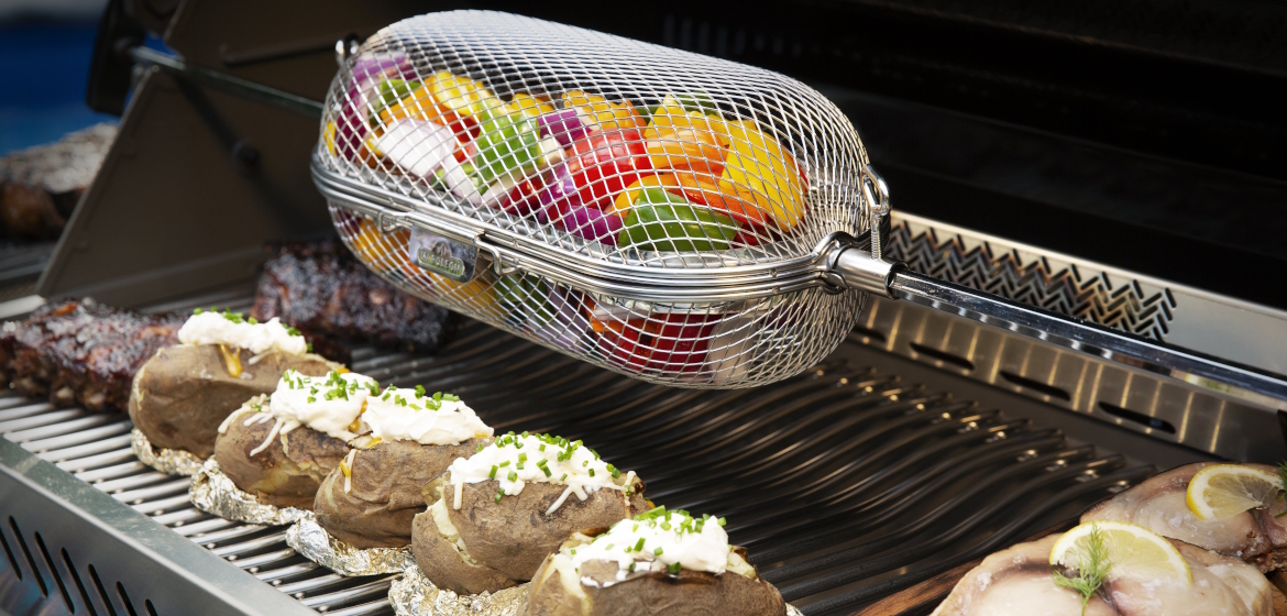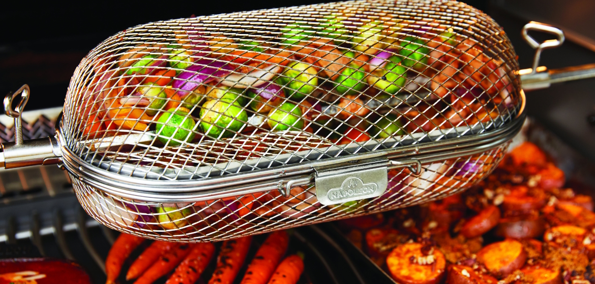 Многофункциональная насадка на вертел цилиндрической формы, в которой легко приготовить вкусные овощи, ребрышки, куриные крылышки, бедра, голени и многое другое, без добавления масла. Используется с электрическим вертелом, на котором она надежно фиксируется винтами.