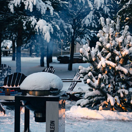 Основание гриля изготовлено из оцинкованной стали с порошковым покрытием и имеет четыре всепогодных колеса. Два из них, большого диаметра, служат для удобного перемещения гриля по неровным поверхностям, а два маленьких колеса оснащены стОпорами, для надежной фиксации гриля на выбранном месте.