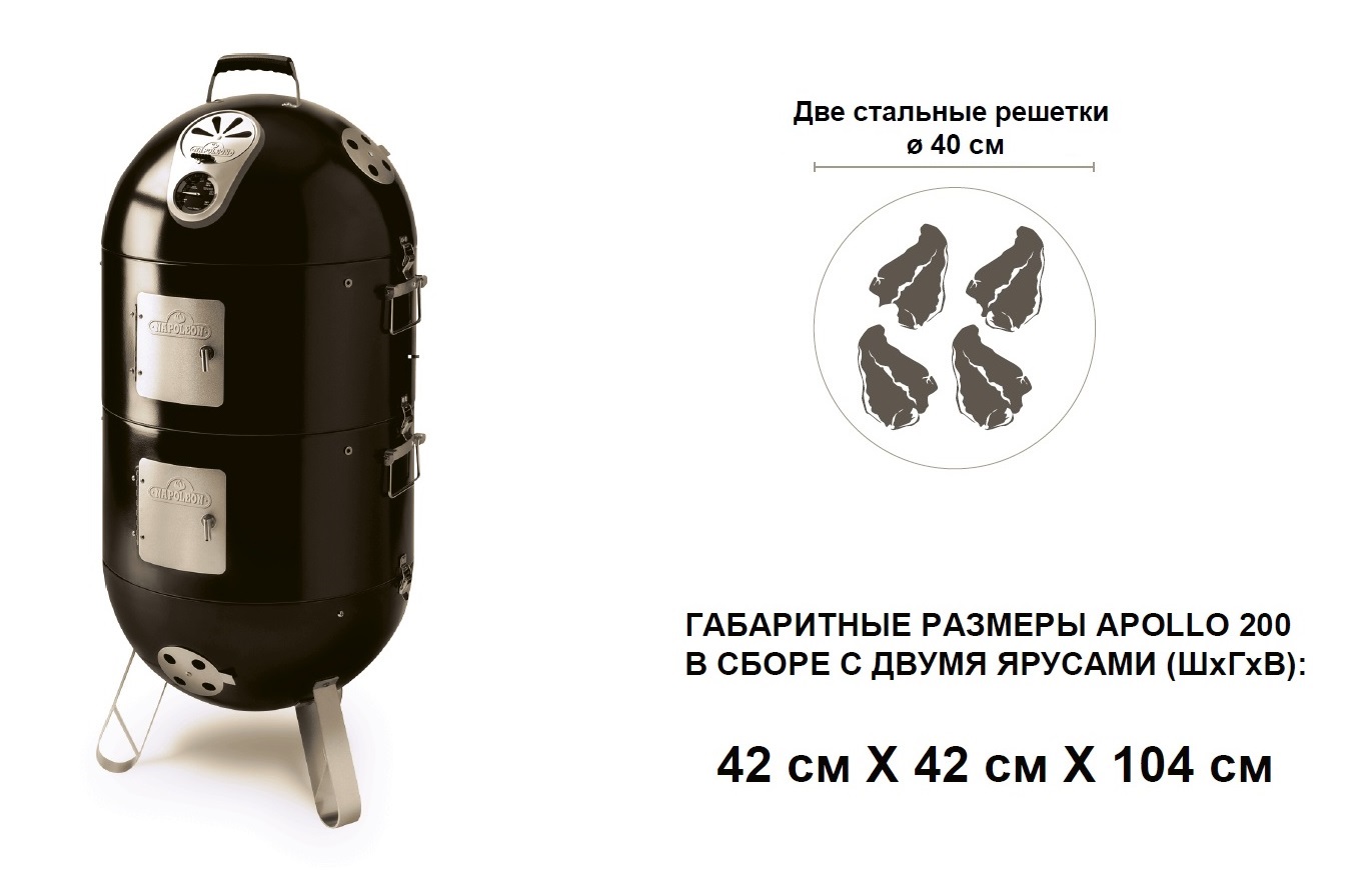 No grilling enthusiast's yard is complete without the Napoleon Apollo® 200 Charcoal Grill and Water Smoker. This three in one grill can go from compact and portable charcoal grill to a full-sized smoker in a matter of moments. A heavy gauge porcelain enameled body circulates smoke around food. Control the burn rate and temperature of the charcoal with the sliding vents at the top and bottom of this grill. Temperature monitoring is easy with the built-in ACCU-PROBE™ temperature gauge. There are temperature eyelets at each level for further monitoring. Use the easy access doors to check on food, smoke levels, or add more charcoal and wood chips. Use the included meat hooks to hang foods for smoking too. Start a new hobby, or take your grill mastery to a new level with the Apollo® 200 Charcoal Grill and Water Smoker.