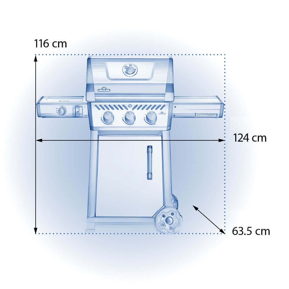 Высота гриля с закрытой крышкой составляет 116 см., а его ширина, с разложенными столиками – 124 см. Высота рабочей поверхности – 91 см., а высота гриля с открытой крышкой составляет – 155 см.