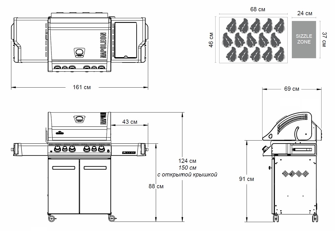 Высота гриля с закрытой крышкой составляет - 124 см., а его габаритная ширина - 161 см. Рабочая поверхность расположена на высоте – 91 см., а высота гриля с открытой крышкой составляет - 150 см.