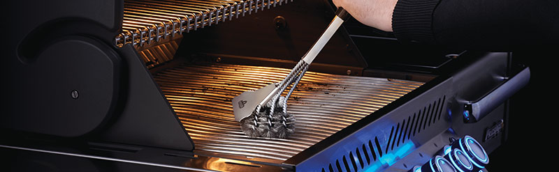 Вы можете чистить гриль, пока он ещё горячий, после приготовления пищи или перед приготовлением на гриле, когда он разогрет. Увеличьте температуру и хорошо прогрейте гриль, затем тщательно почистите решётки щёткой для гриля. Напоминаем, что чугунные решётки, покрытые фарфоровой эмалью можно чистить только щётками с латунным ворсом (например, арт.62028 или арт.62062).