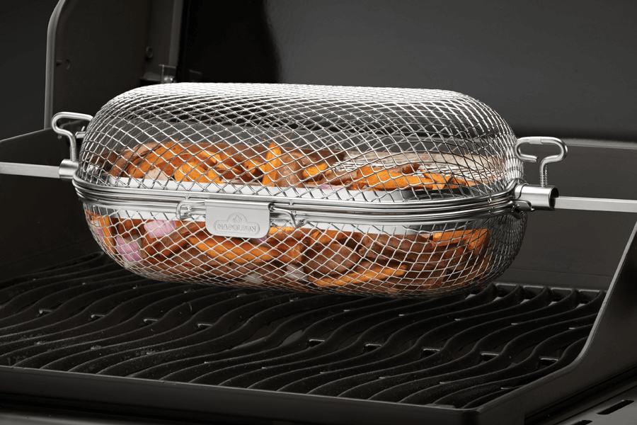 В арсенале аксессуаров NAPOLEON® есть оригинальная насадка на вертел (арт.64005). Используя её можно приготовить продукты, которые сложно нанизать на шампуры или вертел.Она устанавливается также, как и корзина. Ось вертела продевается в муфты и фиксируется. Всё очень быстро и просто!