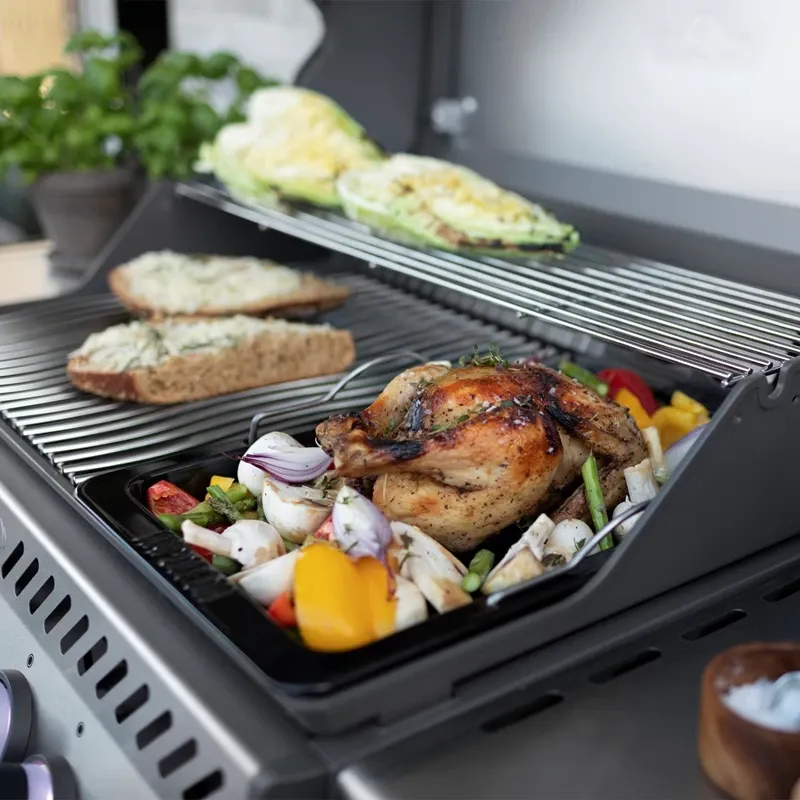 Например, Вы готовите большой кусок мяса на вертеле. Корочка шкварчит… с неё капает ароматный жирок…. Поставьте противень на рабочую поверхность гриля, прямо под основное блюдо и положите в него картошку или гарнир из овощей… Сок и жир будут стекать с основного блюда и насыщать их своим ароматом. Таким образом Вы приготовите основное блюдо и ароматный гарнир одновременно.