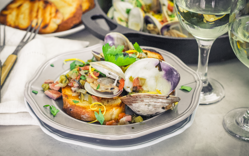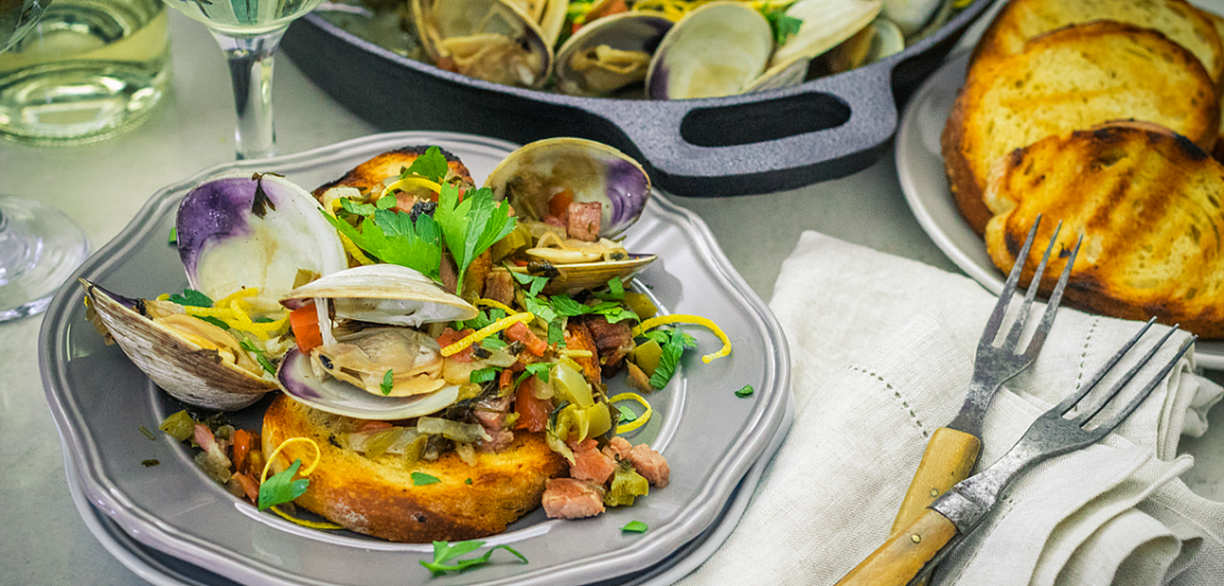 Приготовьте соус софрино. Нагрейте сковороду из чугуна на среднем огне на боковой инфракрасной горелке Sizzle Zone. Готовьте чеснок в масле, пока он не станет хрустящим, добавьте лук, красный перец, при постоянном помешивании доведите лук до того, как он станет мягким и прозрачным. Добавьте лимон, кинзу, лавровый лист, вино и щепотку соли. Уменьшите огонь, доведите соус до кашеобразного состояния и затем переложите софрито в миску. Выньте кожуру лимона и лавровый лист. Поджарьте на прямом огне панчетту. Добавьте в соус нарезанную панчетту, приготовленную на гриле, и отставьте в сторону