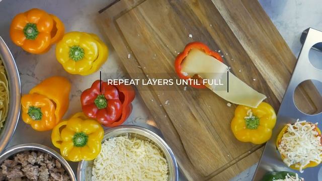 Поместите один край готовой лазаньи в перец, при этом пусть основная часть пока остается снаружи. Выложите в перец слой соуса, мяса и смеси с сыром. Закройте эти слои торчащей частью листа лазаньи и надавите на начинку. Если в перце еще есть место, повторите выкладку всех слоев еще раз. Последний верхний слой пасты покройте соусом и посыпьте сыром. Поставьте подготовленные перцы в подставку для запекания перцев от Napoleon