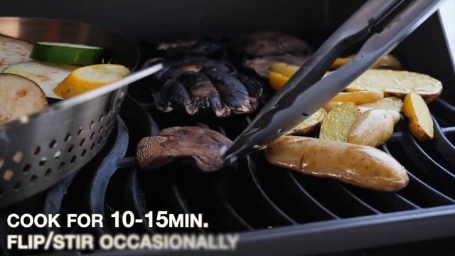 Переложите овощи в перфорированную сковороду или противень для жарки овощей от Napoleon. Половинки картофеля и грибы положите прямо на решетки гриля