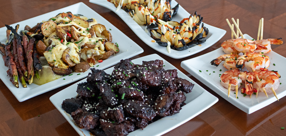 Начните с говядины. Она займет больше всего времени. Разогрейте гриль до 120°С. Удалите кости с говяжьих ребрышек, затем нарежьте мясо на маленькие кусочки, оставляя немного жира. Обваляйте подготовленное мясо в приправе. В течение 2 часов готовьте говядину в противне для жарки Napoleon из нержавеющей стали, используя косвенный жар