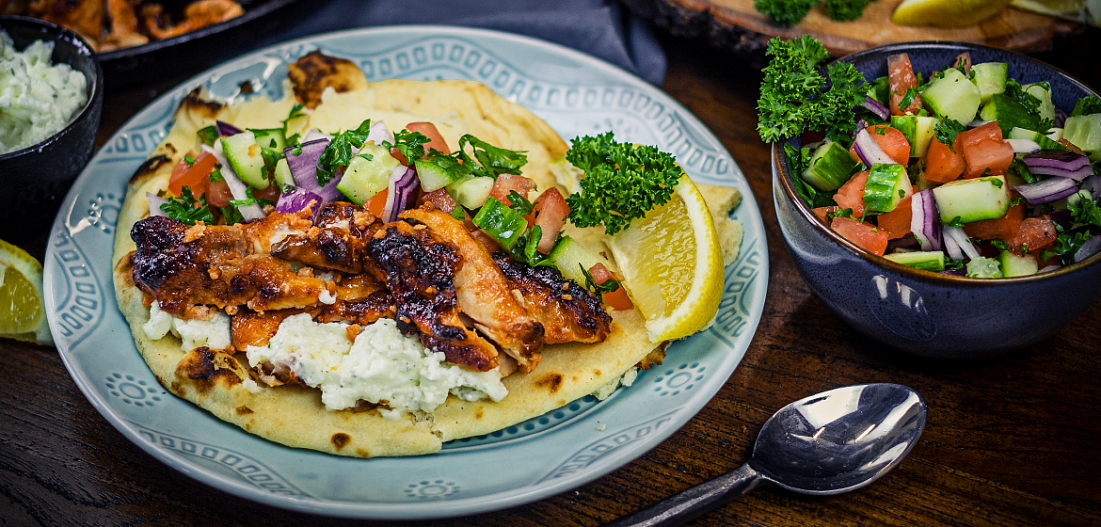 Готовьте курицу на вертеле в течение часа или до того момента, когда она начнет обугливаться, а ее внутренняя температура достигнет 73°С. За 5-10 минут до готовности подогрейте на гриле лепешки наан