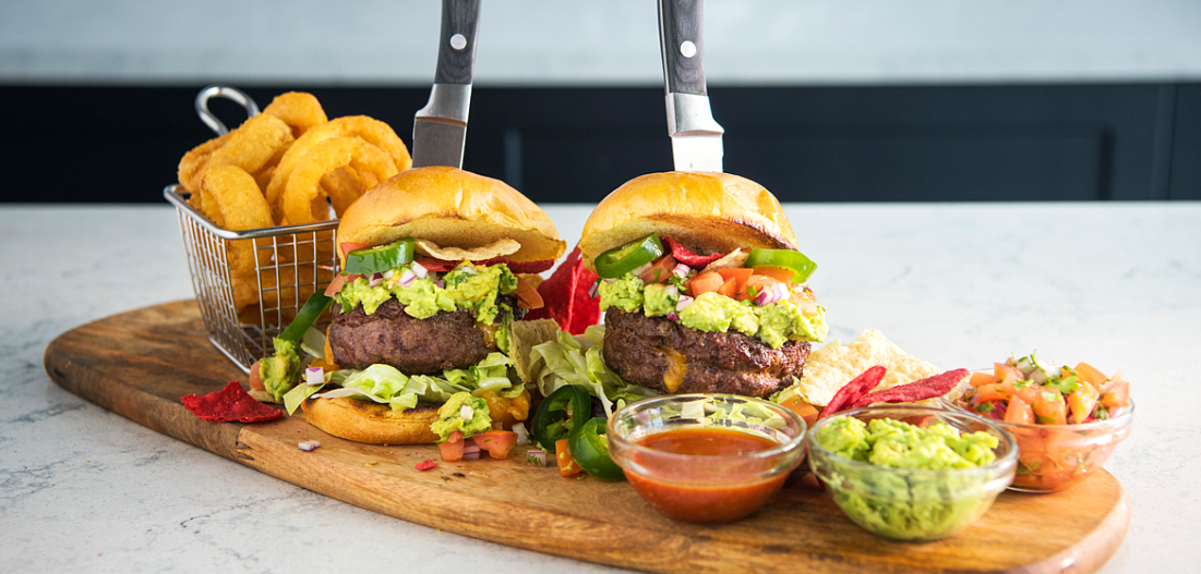 Собирайте Ваши бургеры. Снизу вверх: булочка, салат-латук, котлета, гуакамоле, томатная сальса, халапеньо, острый соус Табаско, измельченные кукурузные чипсы, булочка