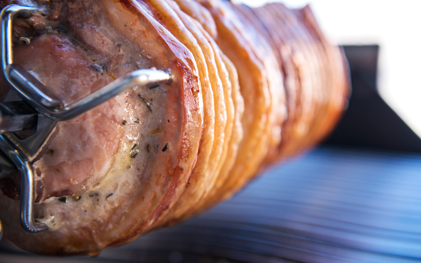 Зажгите заднюю инфракрасную горелку Вашего гриля до высокой температуры, между 150°С и 180°С. Жарьте поркетту в течение 1,5 - 2 часов, пока внутренняя температура не достигнет 70°С и кожа не станет хрустящей