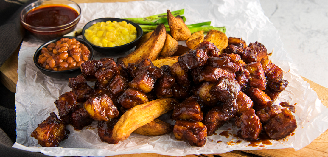 Положите кубики мяса в большой лоток-жиросборник и поставьте его в разогретый гриль. Поместите щуп от Bluetooth-термометра Napoleon в кусок свиного грудинки