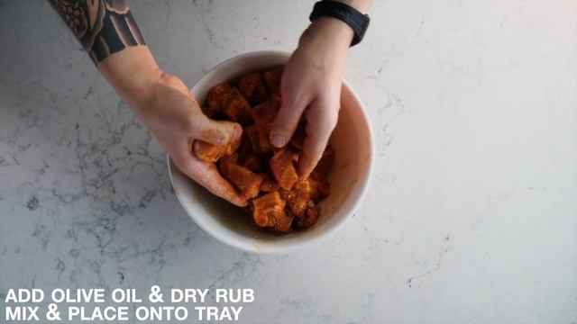 Положите свинину в сухой маринад и добавьте оливковое масло. Хорошо перемешайте, чтобы каждый кусочек грудинки был покрыт маринадом