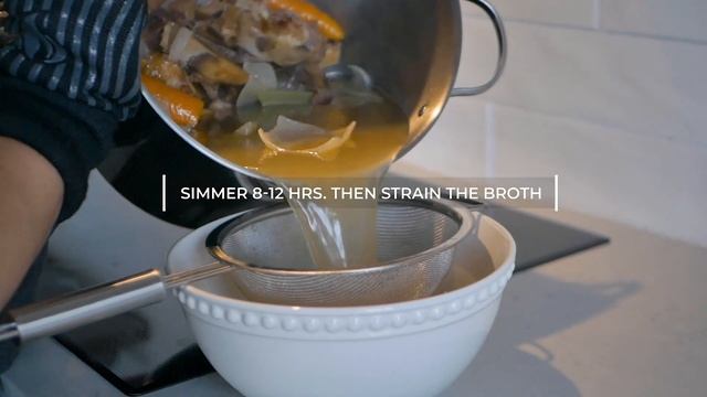 Когда кости достаточно подкоптятся, снимите их с гриля. Положите кости в кастрюлю и добавьте воду (вода должна покрывать кости), жареный чеснок, морковь, сельдерей и порезанную на четвертинки луковицу (не копченую). Тушите 8-12 часов. Этот этап очень важен для приготовления вкусного бульона. Вы можете заняться приготовлением бульона вечером перед днем подачи супа или даже за 5 дней до назначенного дня