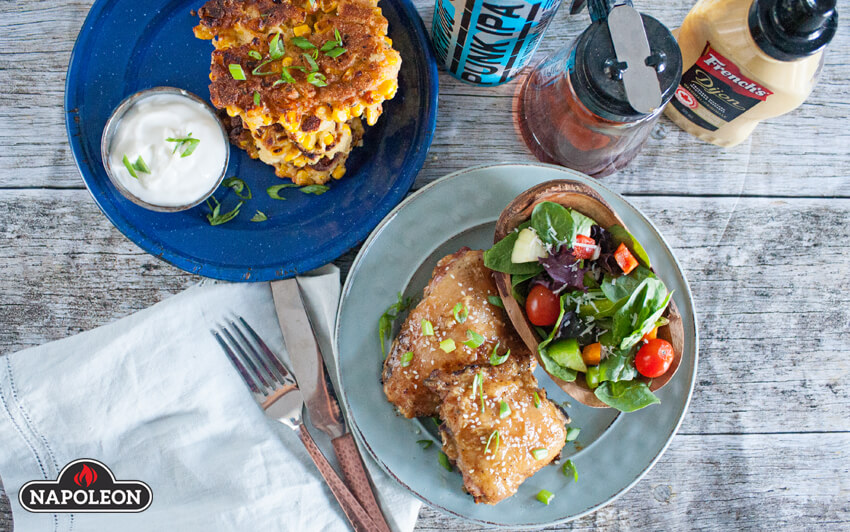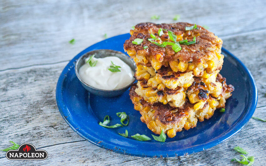 Кукурузные оладьи – это вкусные маленькие лепешки из теста с кукурузой, похожие на жареные во фритюре оладушки. Секрет этого блюда в сладкой кукурузе со вкусом дымка и нежном чесночном соусе, которые идеально дополняют друг друга. Поделитесь своими любимыми закусками, приготовленными на гриле Napoleon в социальных сетях, используя хэштеги #NapoleonRussia #NapoleonGrills #NapoleonProducts